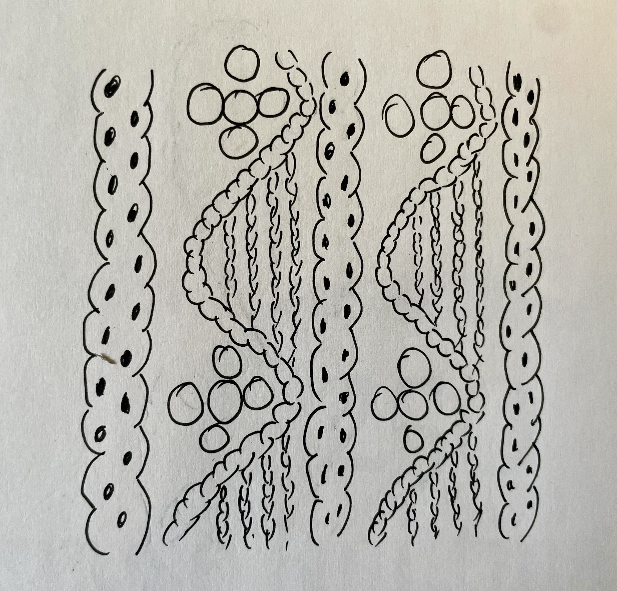 The first has a line that winds around groups of bobbles which might represent the curlicues quite well. (If you have the book, it’s pattern 42 on page 45.) I can’t include an image from the book because it’s under copyright, so I’ve done my best to trace around the knitted sample in the photo. (Rubbish tracing – was rushing to finish; the columns on far left and right, and in the middle, should all be the same.) The dots are holes.