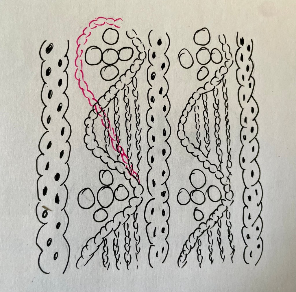 The idea I set out with was to change the path of the travelling stitch (pink line above, see Planning). In practice, as the published pattern moves the snake only one stitch to the left, it proved impossible to stagger (at least for me). I’m also rubbish at the bobbles because they are made using crochet which I have never learned (or wished to – apologies to crochet lovers). A double half crochet bobble, apparently. Hook in hand, I gave it a go (thank you YouTube), and perhaps the set on the left in the main picture is better than the set on the right, but not by much.