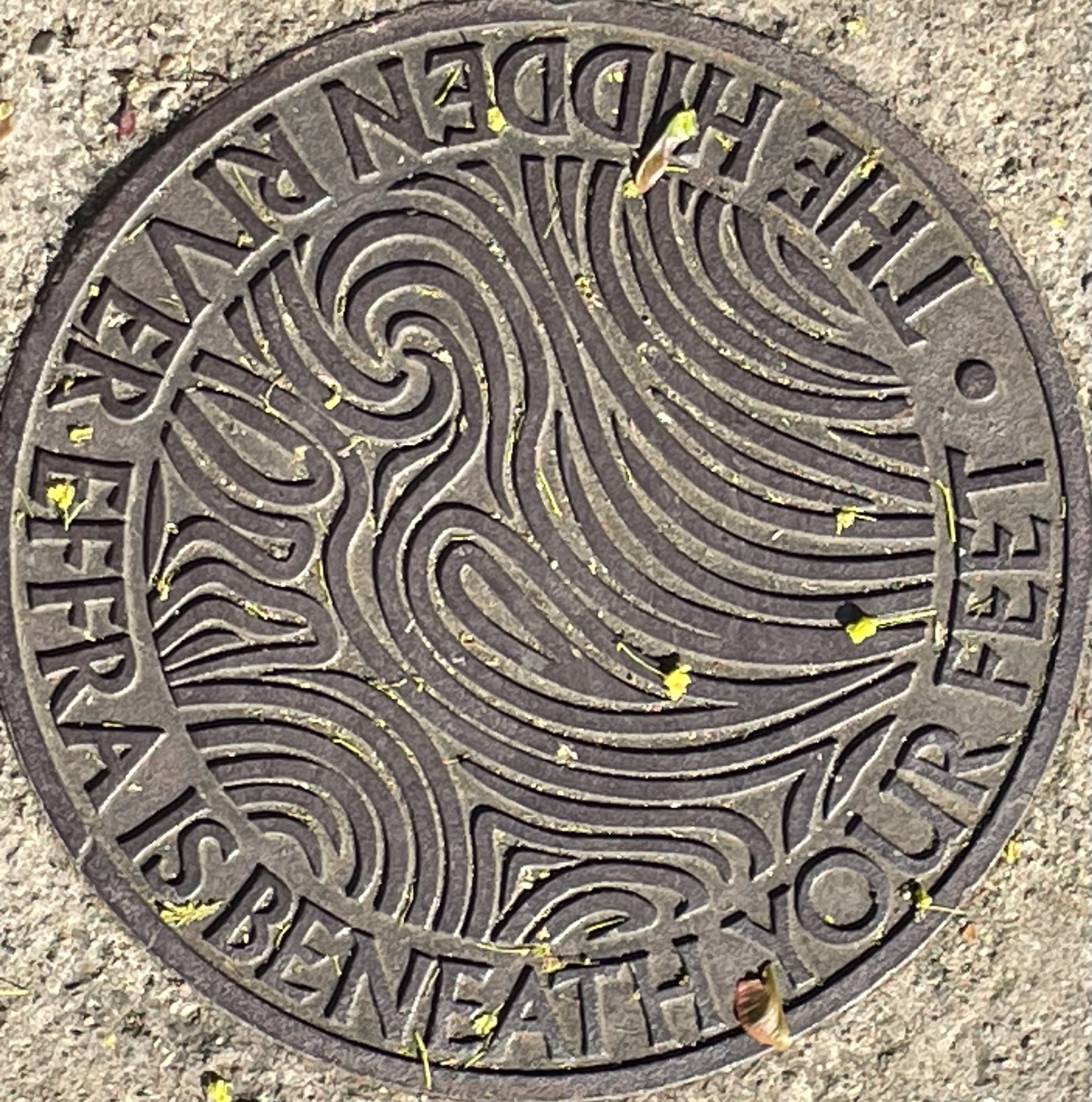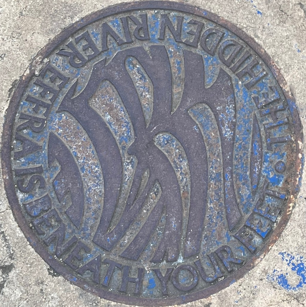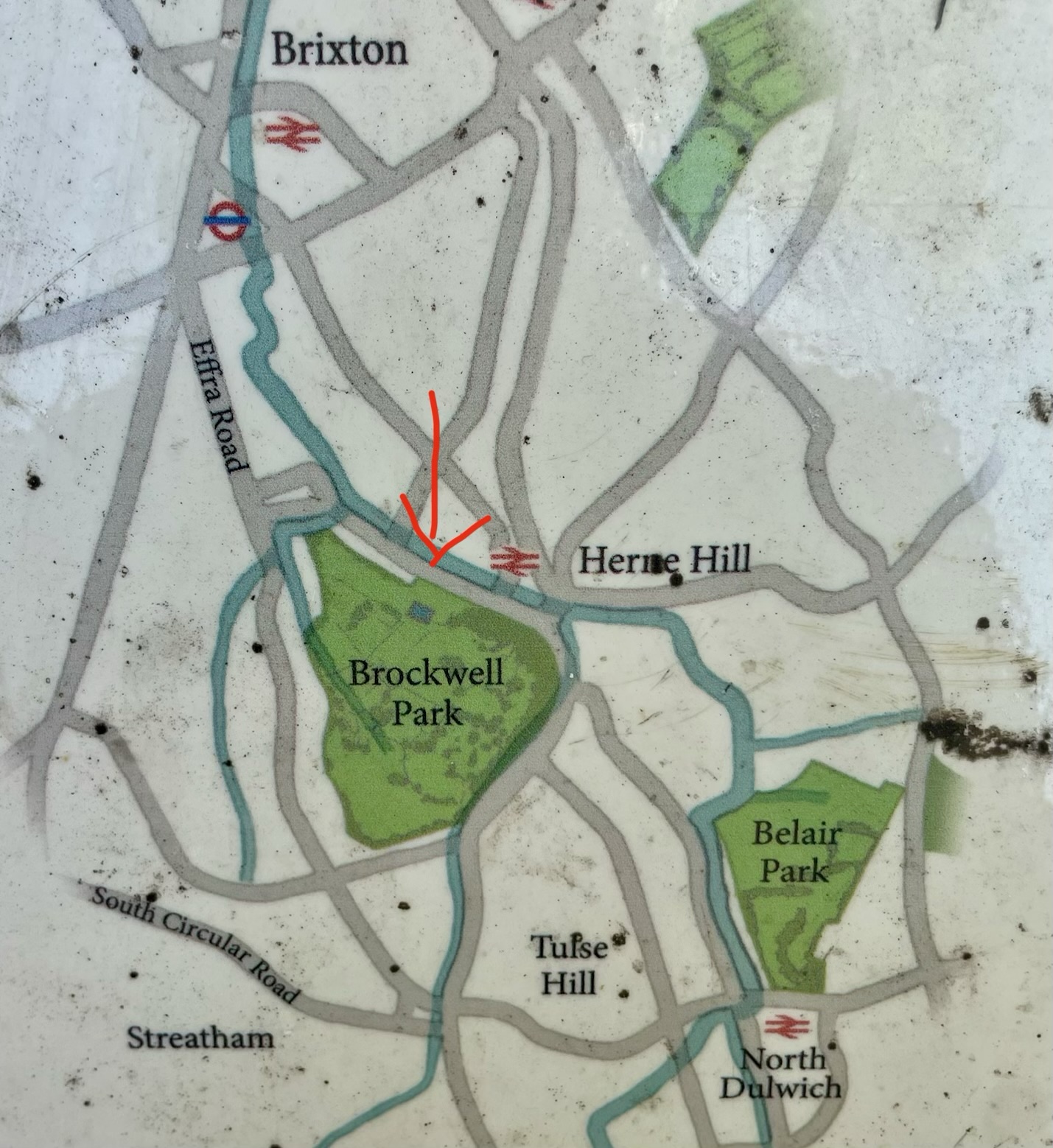 Next to each of the two stink pipes – What’s in a Square? (2) – there is a plaque set in concrete in the ground, bearing the legend ‘The hidden River Effra is beneath your feet’. The map below appears in an explainer panel nearby on the roadside, and shows how the Effra flowed all along Dulwich Road before it was sunk into the Victorian sewers. Badly drawn arrow is all my own work.